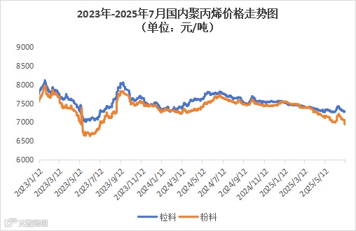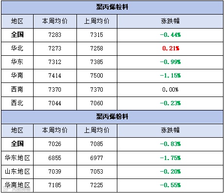 本周聚丙烯市场跌后小涨,价格以跌为主。粉料全国均价为7283元/吨,较上周均价下跌32元/吨,跌幅为0.44%。粒料全国均价为7026元/吨,较上周均价下跌59元/吨,跌幅为0.83%。