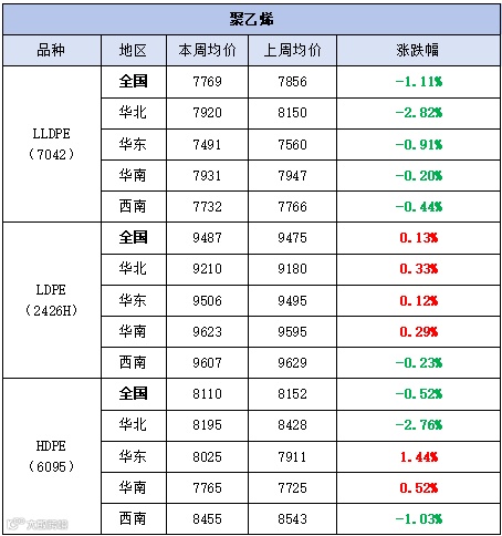 本周聚乙烯市场先抑后扬,价格跌多涨少。LLDPE(7042)市场均价为7769元/吨,较上周均价下跌87元/吨,跌幅为1.11%;LDPE(2426H)市场均价为9487元/吨,较上周均价上涨12元/吨,涨幅为0.13%;HDPE(6095)市场均价为8110元/吨,较上周均价下跌42元/吨,跌幅为0.52%。