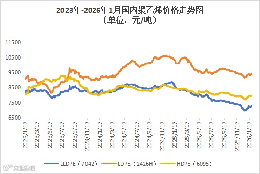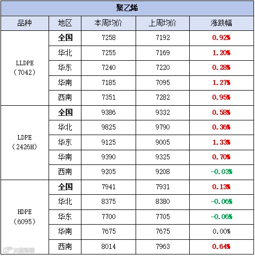 本周聚乙烯市场震荡上行,价格以涨为主。LLDPE(7042)市场均价为7258元/吨,较上周均价上涨66元/吨,涨幅为0.92%;LDPE(2426H)市场均价为9386元/吨,较上周均价上涨54元/吨,涨幅为0.58%;HDPE(6095)市场均价为7941元/吨,较上周均价上涨10元/吨,涨幅为0.13%。