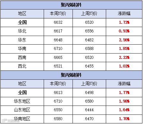 本周聚丙烯市场偏强整理,价格重心上移。粉料全国均价为6632元/吨,较上周均价上涨112元/吨,涨幅为1.72%。粒料全国均价为6613元/吨,较上周均价上涨115元/吨,涨幅为1.77%。