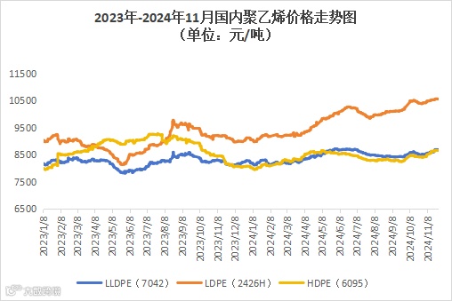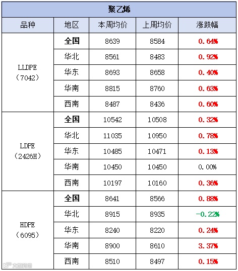 本周聚乙烯市场偏强震荡,价格以涨为主。LLDPE(7042)市场均价为8584元/吨,较上周均价上涨55元/吨,涨幅为0.64%;LDPE(2426H)市场均价为10508元/吨,较上周均价上涨34元/吨,涨幅为0.32%;HDPE(6095)市场均价为8424元/吨,较上周均价上涨76元/吨,涨幅为0.88%。