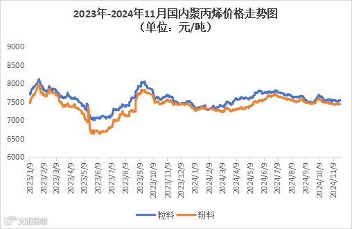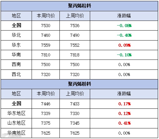 本周聚丙烯市场窄幅下行,价格涨跌不一。粉料全国均价为7530元/吨,较上周均价下跌6元/吨,跌幅为0.08%。粒料全国均价为7446元/吨,较上周均价上涨13元/吨,涨幅为0.17%。