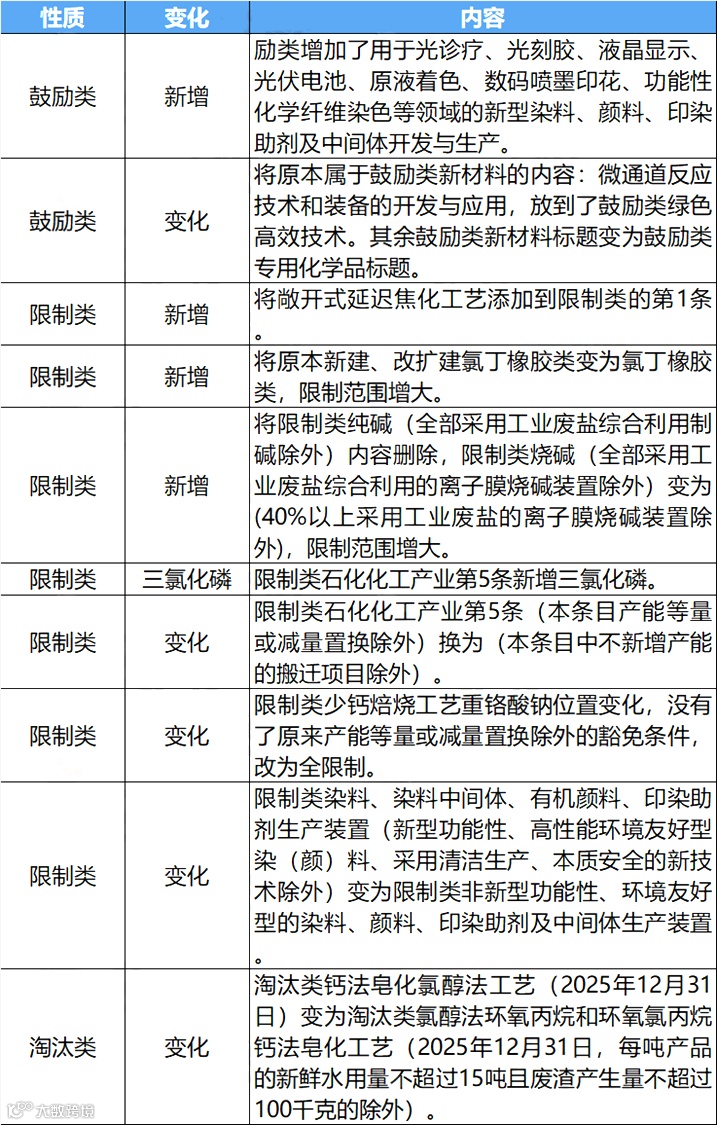 从最新发布的2024本中可以看到,有诸多化工产业被列入到限制类发展条目中,其中包括与“氯”、“焦化”、“烧碱”、“磷”、“焙烧”、“印染”等关键字眼相关的产业,也在扩大器限制类范围。从这一点上可以看到,中国化工产业在于“高能耗”、“高污染”、“高资源性”的项目限制范围呈现扩大的趋势,对此类项目的发展政策要求不断提高,倒逼中国化工产业的转型提速。