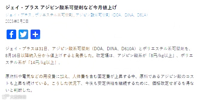 8月1日,日本一家丙酮大型生产商KH株式会社宣布于8月8日起,将提高公司生产的各种化学的价格。涨价产品及涨幅如下: