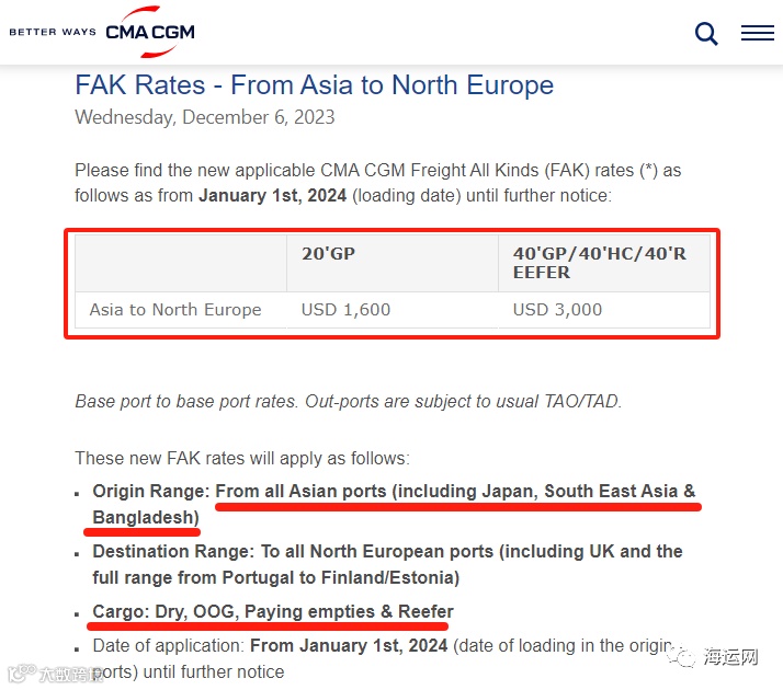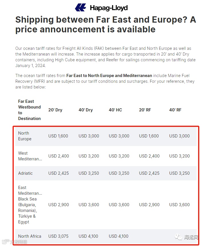 自2024年1月1日(货物装船日)起调升亚洲至北欧和地中海FAK费率,直至另行通知。赫伯罗特此次涨价,较12月15日生效的亚洲至北欧和地中海FAK费率相比,涨幅高达30%。具体收费标准如下: