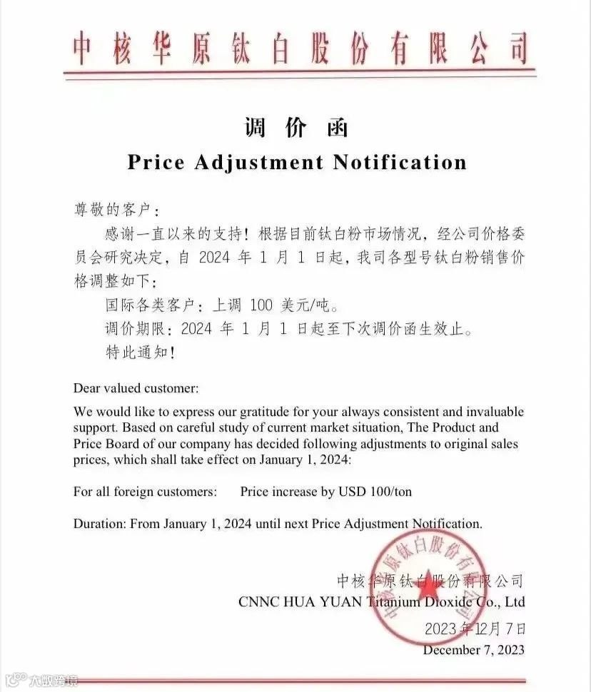 龙佰集团宣布,自2024年1月1日起,公司各型号钛白粉销售价格在原价基础上对国际各类客户上调100美元/吨。