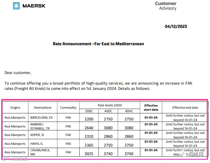 从2024年1月1日起调升远东至地中海FAK费率。具体收费标准如下: