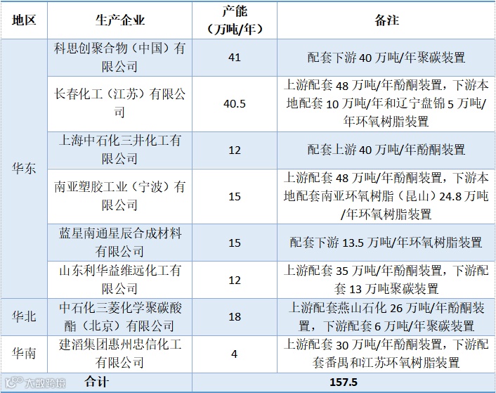 表1 中国内地双酚A主要生产企业