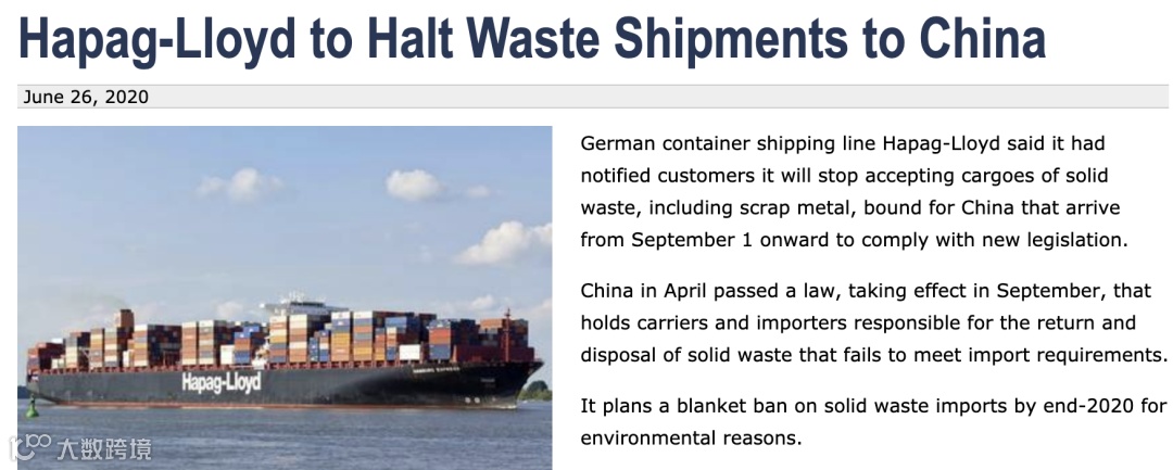 Hapag-Lloyd等集装箱船公司也已发出声明不再运输洋垃圾进口到中国。