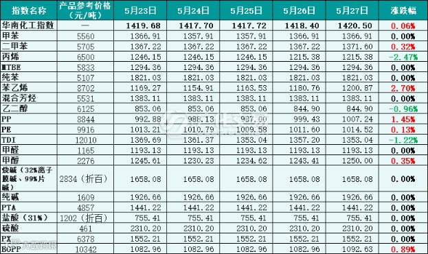 图1:华南化工指数本周参考数据(基数:1000),参考价为贸易商报价
