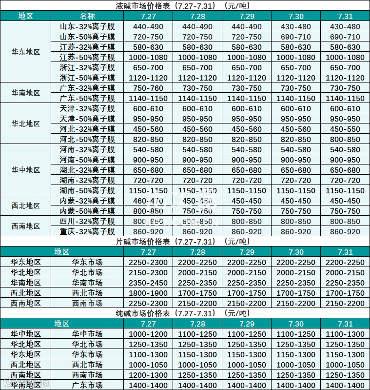 碱类报价(7.27-7.31)