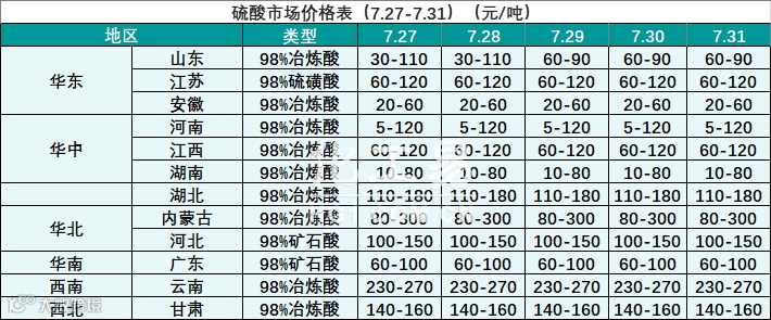 硫酸报价(7.27-7.31)