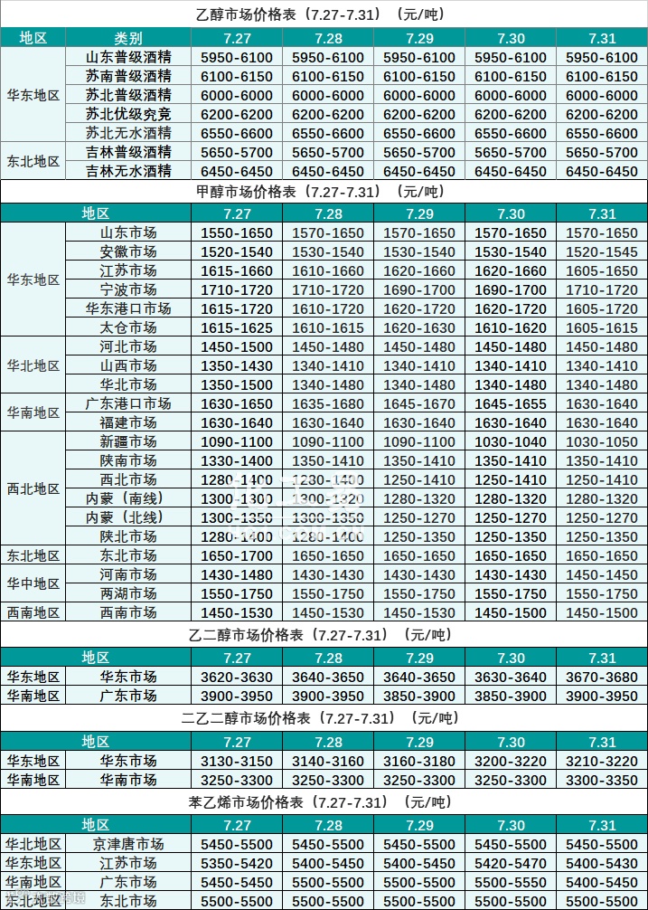 醇类报价(7.27-7.31)