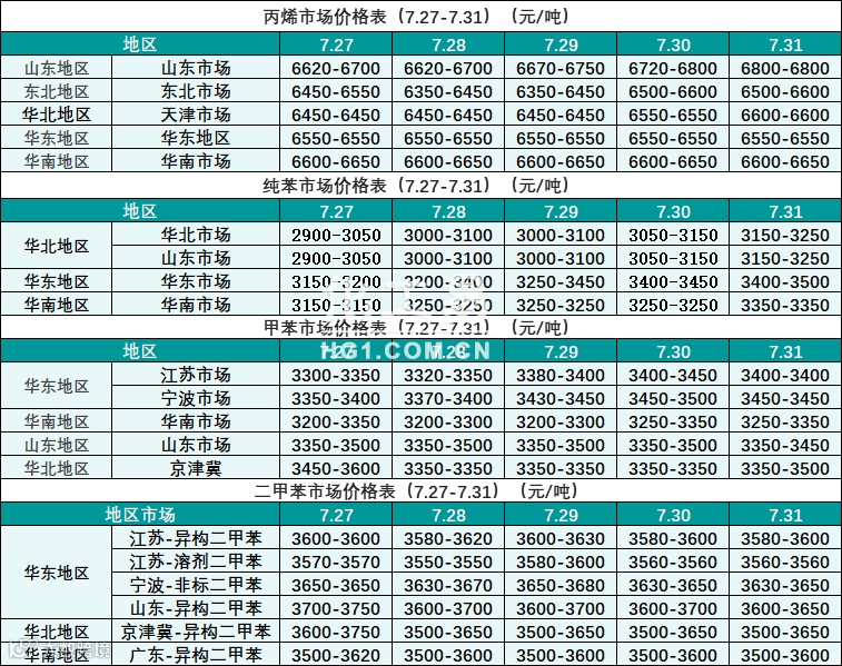 烃类报价(7.27-7.31)