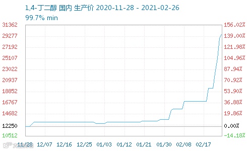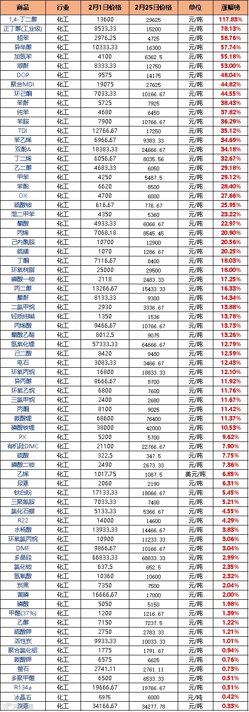 1,4-丁二醇:从2月1日的13600元/吨,上涨到29625元/吨↑↑,涨幅高达117.83%!