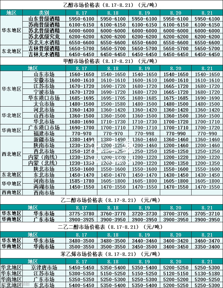 醇类报价(8.17-8.21)
