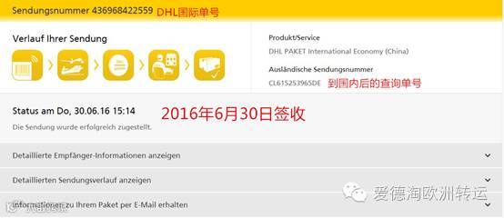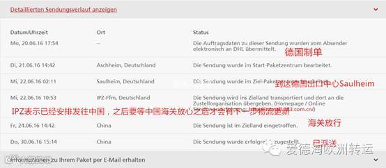 点击运单号之后会直接跳转到DHL的官网跟踪页面,是不是看到一堆字母头都大了呢,每个包裹的物流流程是一样的,小编把德文翻译了给亲们做参考,亲们自己查的时候就知道是到哪一步了。