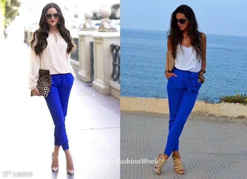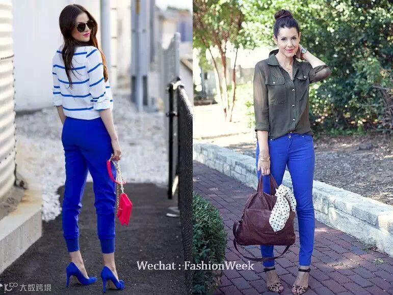 宝蓝色裤子是时尚搭配必不可少的单品,搭配一件纯色上衣使得整体清新自然,不需要多复杂的款式,也是颜色的搭配就足以看出一个人的品味了!