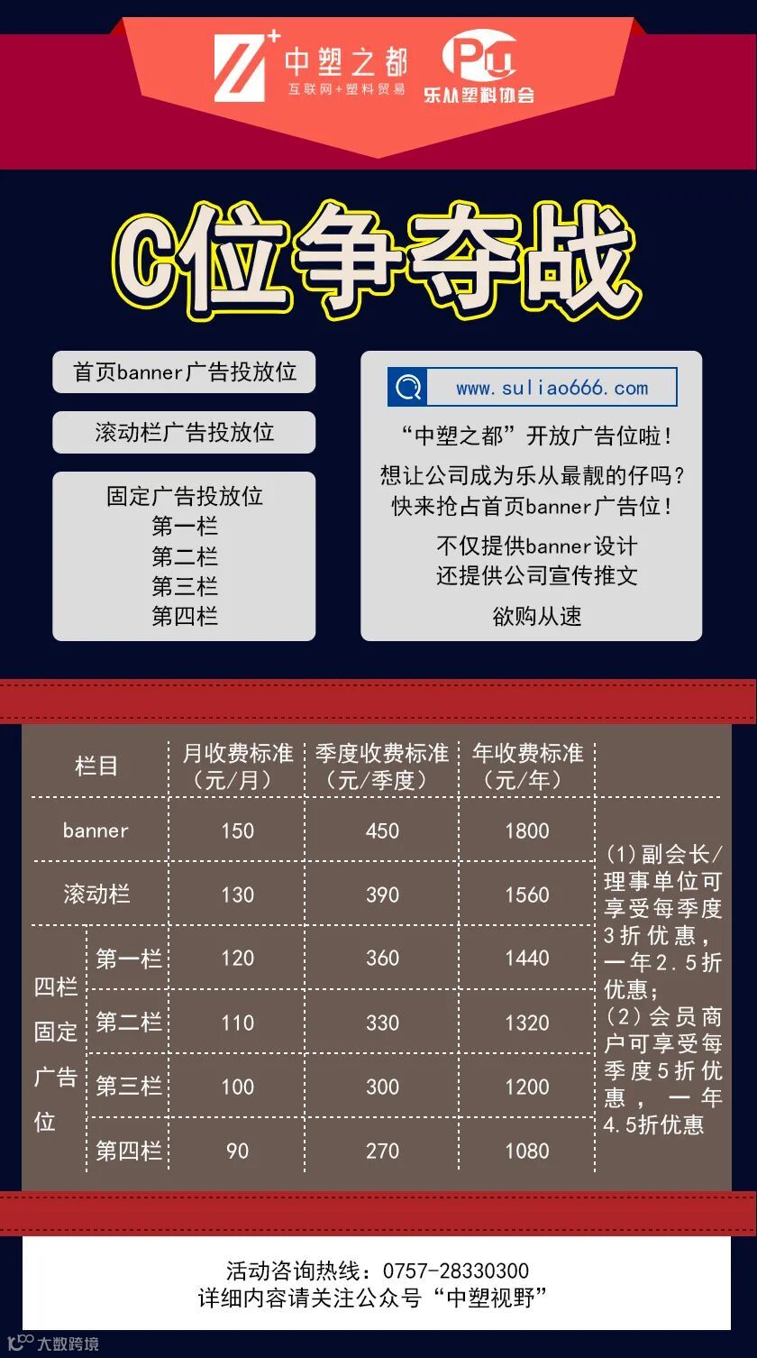 中塑之都因乐从塑料城商户的需求而集结,现在确认了用户需求和网站运营实际情况后,我司将划出部分广告位以供各位进行公司和产品的宣传与推广。
