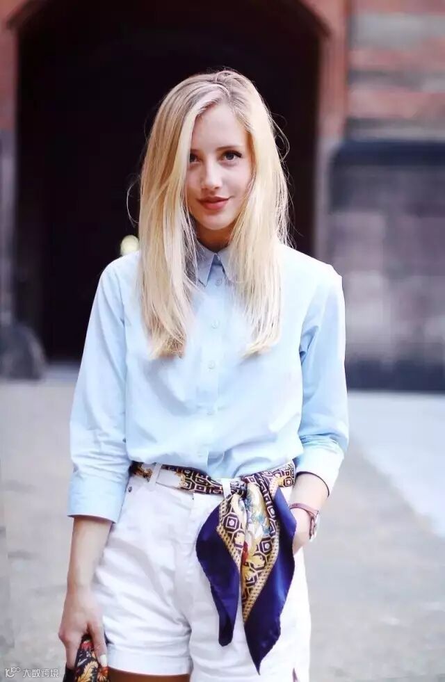 颜色过于单一的服装配一条亮色的丝巾在腰间就能起到很好的修饰作用。