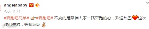 Baby也发微博表示:“不变的是陪伴大家一路奔跑的心,欢迎热巴。这次你们先跑,等我归队。”