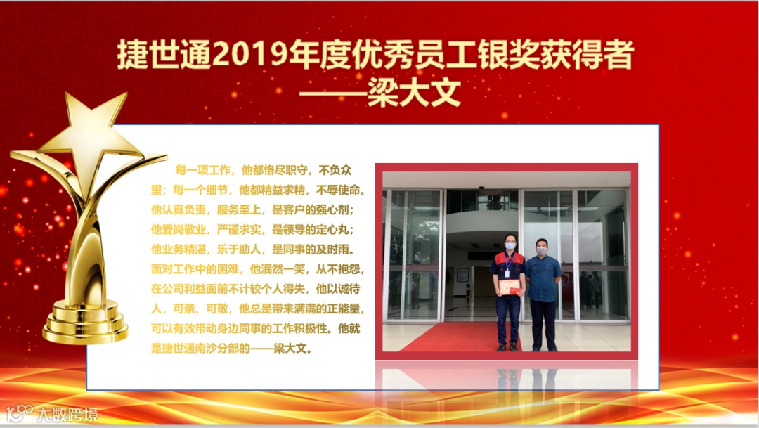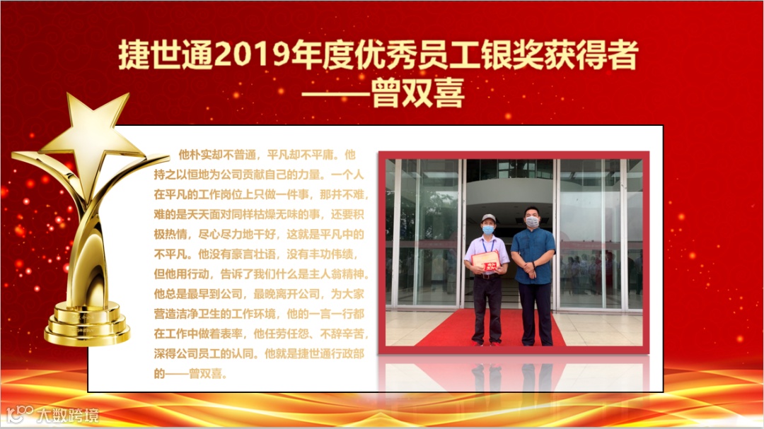 树立先进典范,发扬捷世通“不怕累,就怕不累”的精神,由高芳总裁为“2019年度优秀员工”颁奖,获奖的分别是南沙分部的仓储员梁大文与广州总部的后勤主管曾双喜。他们任劳任怨,恪尽职守,在平凡的岗位上创造出不平凡的价值;他们是身边的榜样,默默影响着更多的人越变越好。