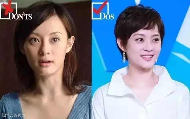孙俪是大家公认的“长发路人、短发女神”的典型,但其实刘海对于她的作用比长短更关键!她的例子特别好的印证了“修饰不等于遮住”这一点。因为孙俪的下颚角比较突出,是方形脸。按理说,长发披肩应该更适合她。其实不然。左图长发时她的偏分短刘海,呈一条直线的形状,让本就有棱有角的脸看起来更凌厉了,而C形刘海的曲线则可以柔化脸部的硬朗线条。不管你是什么款式的刘海,都可以剪成“C”形刘海。