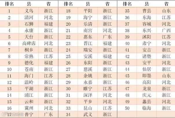 2015年,大众电商创业最活跃的前五个县依次是义乌、清河、石狮、永康和天台,第六至第五十位县详见下表。