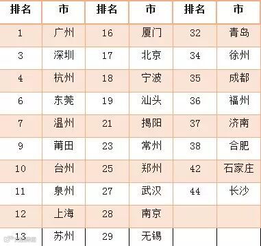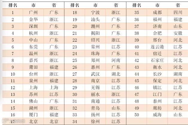 2015年,大众电商创业最活跃的前五个城市依次是广州、金华、深圳、杭州和中山,第六至第五十位城市详见下表。