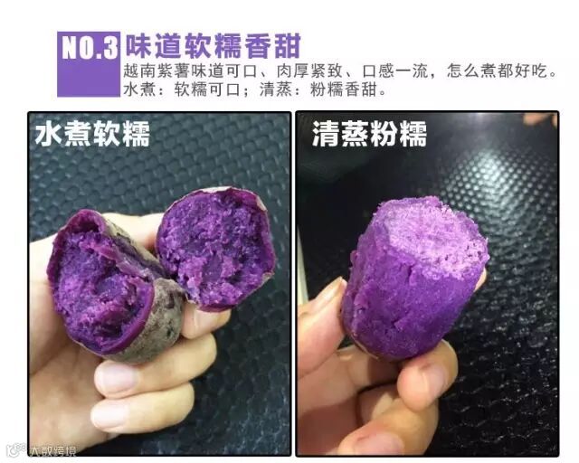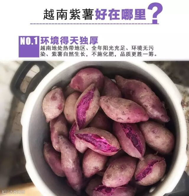 越南独特的热带气候,肥沃的土壤,长时间的光照,为小紫薯的生长创造很好的环境,使得小紫薯比一般的紫薯淀粉和维生素含量更高,所以口感特别粉糯。而且最重要的是,越南紫薯无农药污染,新鲜不泡任何防腐剂水,是不可多得的养生绿色食品。
