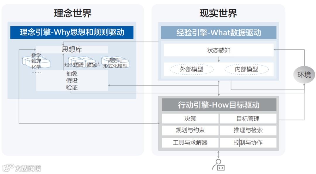 实现结合符号主义的智能需构建三大引擎: 数据驱动的经验引擎、思想规则驱动的理念引擎以及行动引擎。经验引擎依托深度学习处理互联网与感知数据;理念引擎通过抽象验证深 化认知;行动引擎涵盖目标管理、综合推理、 约束规划等实践能力。三大引擎联合形成的高保真世界模型推动智能走向物理世界。