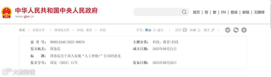 2025年8月26日消息,国务院发布《国务院关于深入实施“人工智能+”行动的意见》