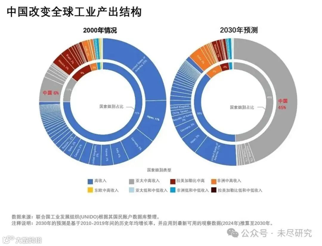 2000年,中国在全球的工业产出仅占6%,高收入国家占全球工业产出的75%。到2030年,中国工业产出将达到全球的45%,而高收入国家的工业产出下降到38%,其中美国占比11%。中国工业产出超过4个美国。事实上,2024年,据统计公报,中国第二产业增加值49.2万亿元,增长5.3%,占GDP比重36.5%,全部工业增加值40.5万亿元,增长5.7%,继续快速增长。