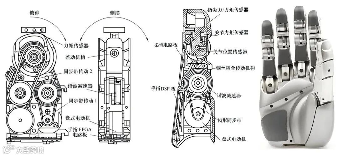 其中,高动态响应直流电机与易于狭小空间传动的柔性材料「腱绳」结合来模拟肌肉驱动效果,驱动电机可放在手掌内或小臂里。如此一来,机器手指就可以变得更轻、转动更灵活。电机也可以用更大的功率来驱动,而不用担心过热问题。