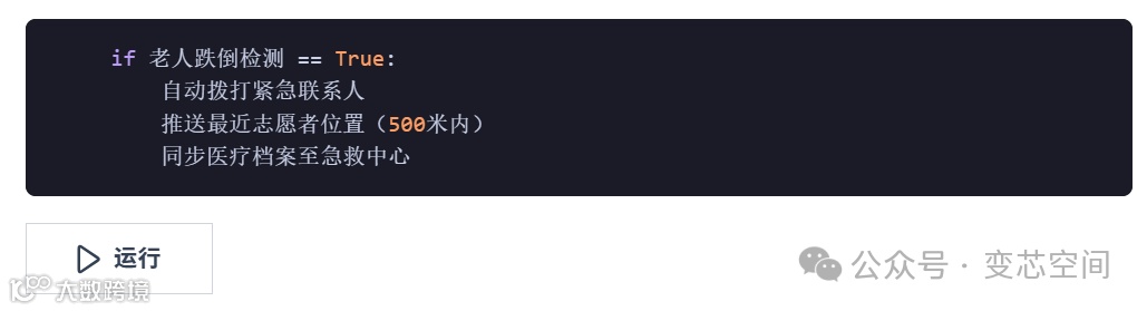 AR护理指导:通过智能眼镜实时识别老人体征(如呼吸频率异常),触发AI语音提示:“检测到血氧低于95%,建议暂停运动并联系家庭医生”。