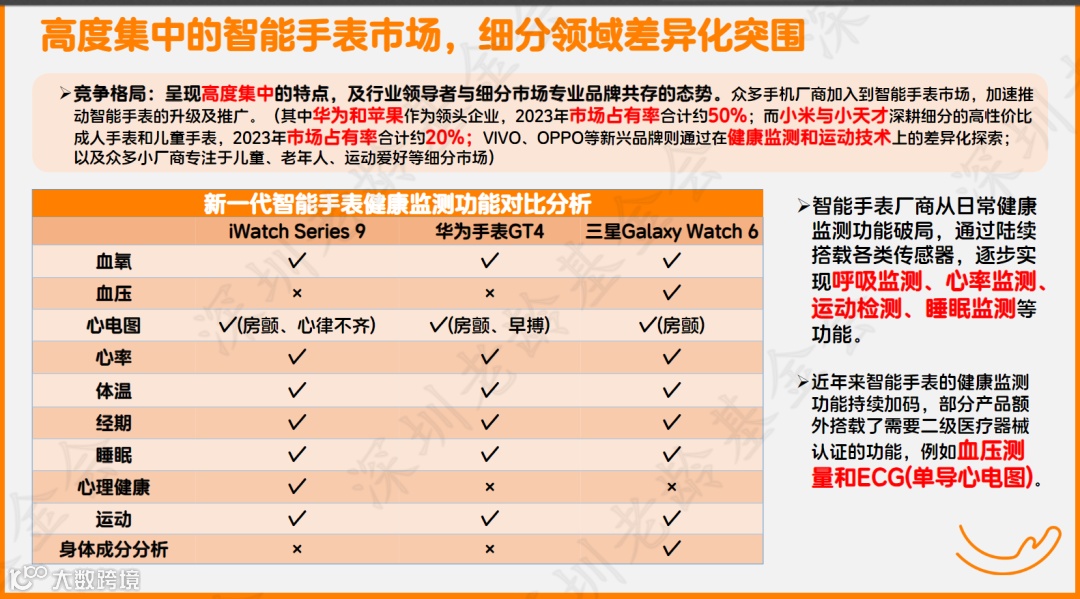 智能手表厂商从日常健康监测功能破局,通过陆续搭载各类传感器,逐步实现呼吸监测、心率监测运动检测、睡眠监测等功能。