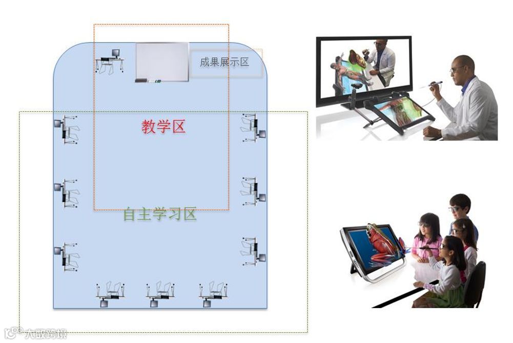 教师区:1 套 zSpace(包含 1 台触控一体机、1 支红外笔和 1 个 3D 追踪眼镜),1台圆偏光3D投影仪,1块3D专用视频显示设备(100 寸~150寸),按照学生数量配置普通3D眼镜。
