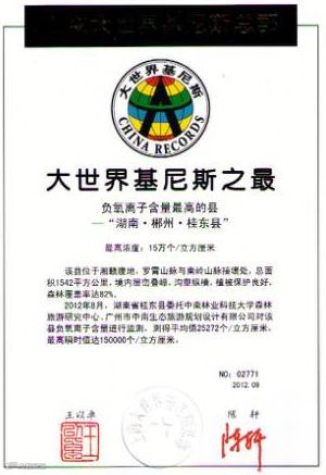 负氧离子 图为:“负氧离子含量最高的县”证书