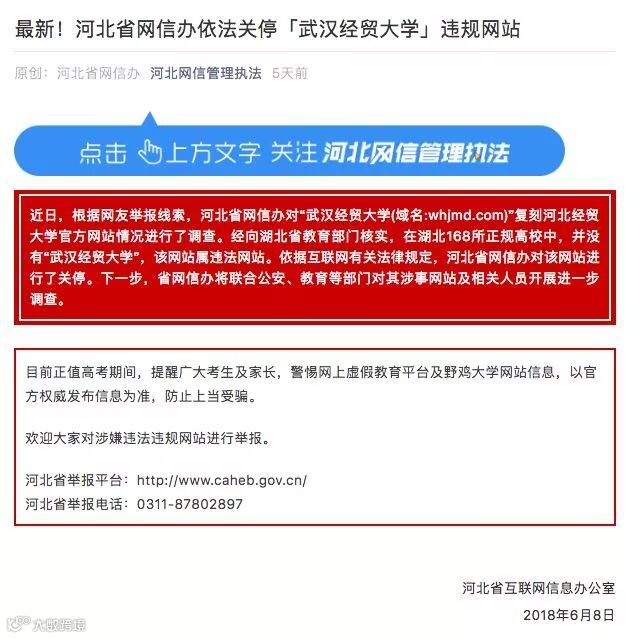近日,“武汉经贸大学”网站中诸多信息涉嫌抄袭河北经贸大学,河北省网信办对该网站进行了关停。高考结束,不仅要识别虚假大学,还有谨防各种诈骗手段(文末附)。