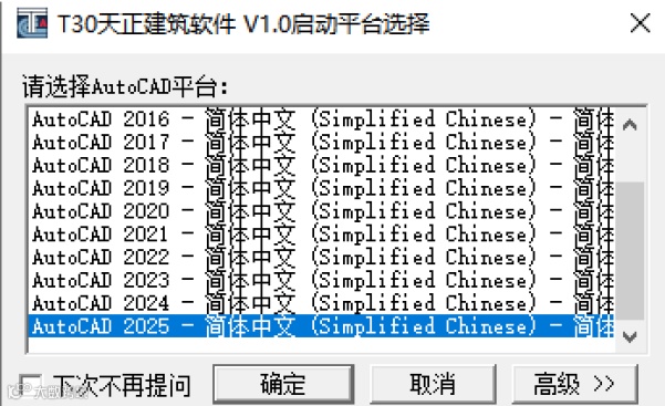 如果用户的机器安装了多个符合天正建筑软件使用条件的AutoCAD 平台(包括AutoCADArchitecture 等在内),首次启动时将提示在平台列表中选择,单击确定后进入平台运行。