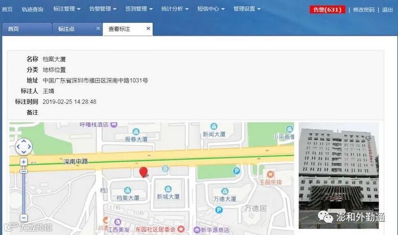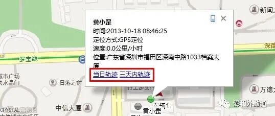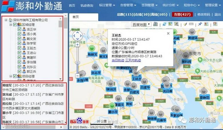 点击人员名称,在右方的地图上显示相对应的详细信息,包含名称、时间、定位方式、位置、服务器的接收时间,同时有快捷查询当日轨迹、三天轨迹的链接入口。