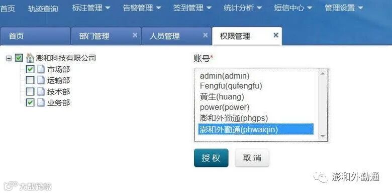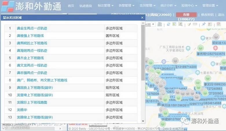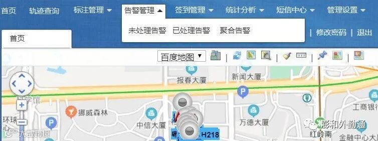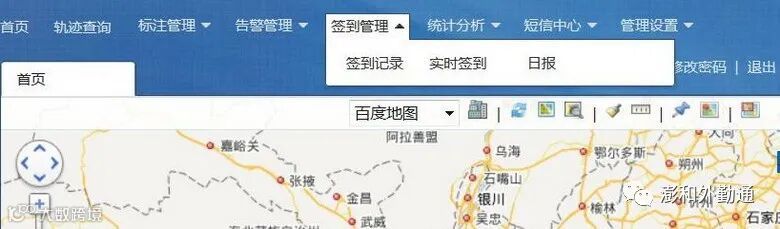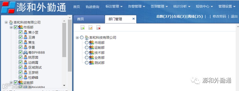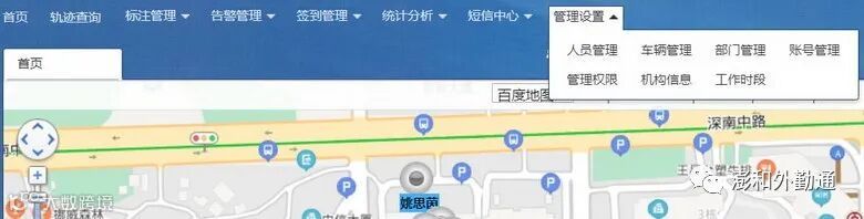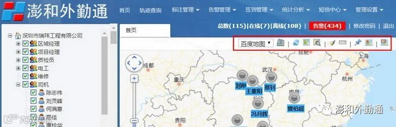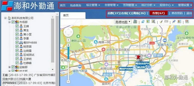 “澎和外勤通”平台主页,上方为功能导航栏:首页、轨迹查询、标注管理、告警管理、签到管理、统计分析、短信中心、管理设置。如图2: