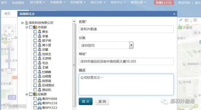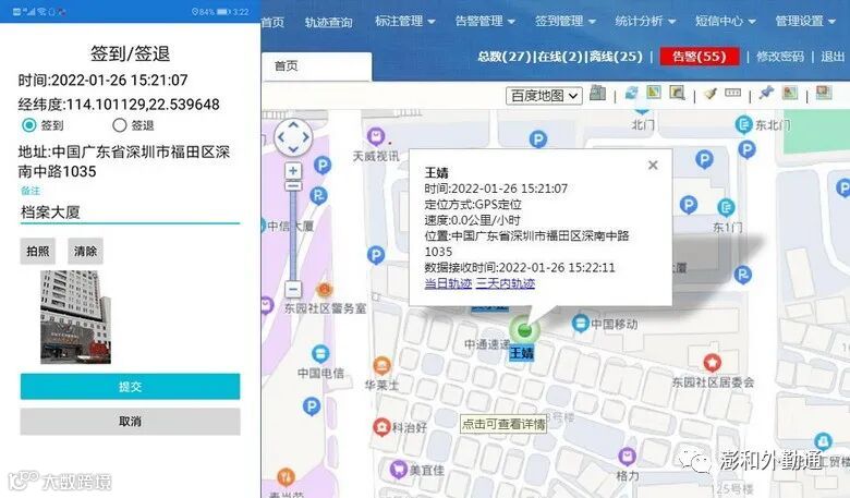 2. 如下图左侧为手机APP界面,点击提交成功后,平台地址栏和地图上都显示实时位置信息。