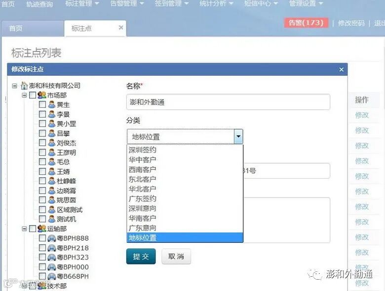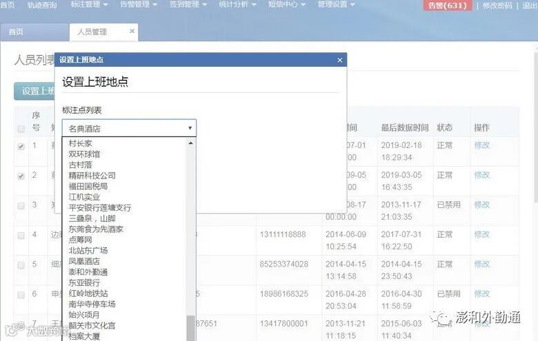 设置上班地点:勾选人员名单,点击“设置上班地点”出现(下图)跳出属性框,从标注点列表中的下拉框中选择地点,提交后完成。