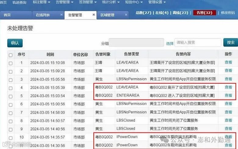 实时状态统计:查询实时状态下,对总人数、上线人数、离线人数、未处理告警人数进行统计。