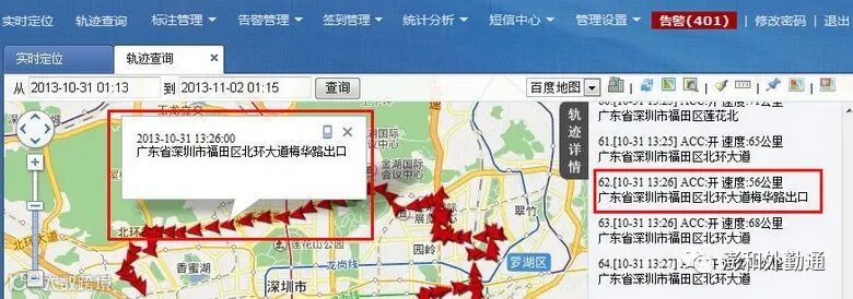 用户可以查询终端设备的历史活动轨迹,设定时间段,即可查询某个终端设备在此时间段内的活动走向和轨迹。系统同样给出每个位置点的终端设备名称、定位时间及当时所在位置描述。轨迹跟踪仅支持单个终端设备。轨迹查询功能主要包括查询路线,轨迹播放,轨迹下载。