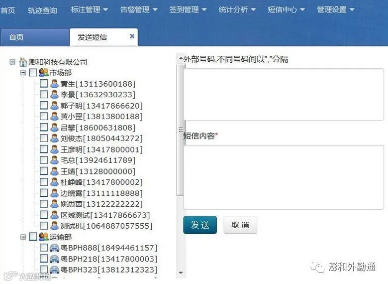 发送短信:(根据规定,短信内容需要提前上报相关部门备案,本平台的短信内容只适合区域告警内容的自动发送。发送其他内容短信,请不要采用本平台短信功能。)