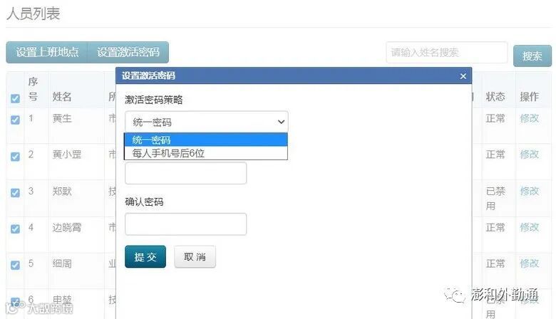 设置激活密码:选择全部人员,设置统一密码,或设置每人手机号后6位,点提交,设置成功。也可以单选个人进行单独设置;