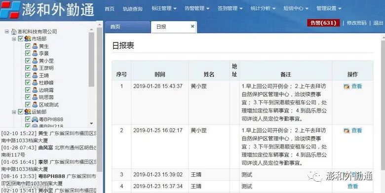 3. “每日考勤表”中的人员名单中,并非显示所有人员的名单信息,在当日通过使用“澎和外勤通”手机客户端软件,并使用“签到”功能成功上报数据后的,才会在“每日考勤表”中显示数据,而当日未使用“签到”功能成功上报数据的人员的名单将不会出现数据信息。