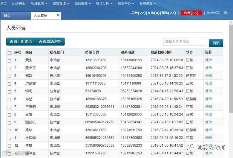 “管理设置”,点击 “人员管理”;出现人员列表页面。在表格上方有“设置上班地点”、“设置激活密码”选项;表格的内容为:序号、姓名、所在部门、终端号码、联系电话、创建时间、最后数据时间、状态、操作,在操作项中有个功能项:修改,点击相关项进行操作,如图所示。